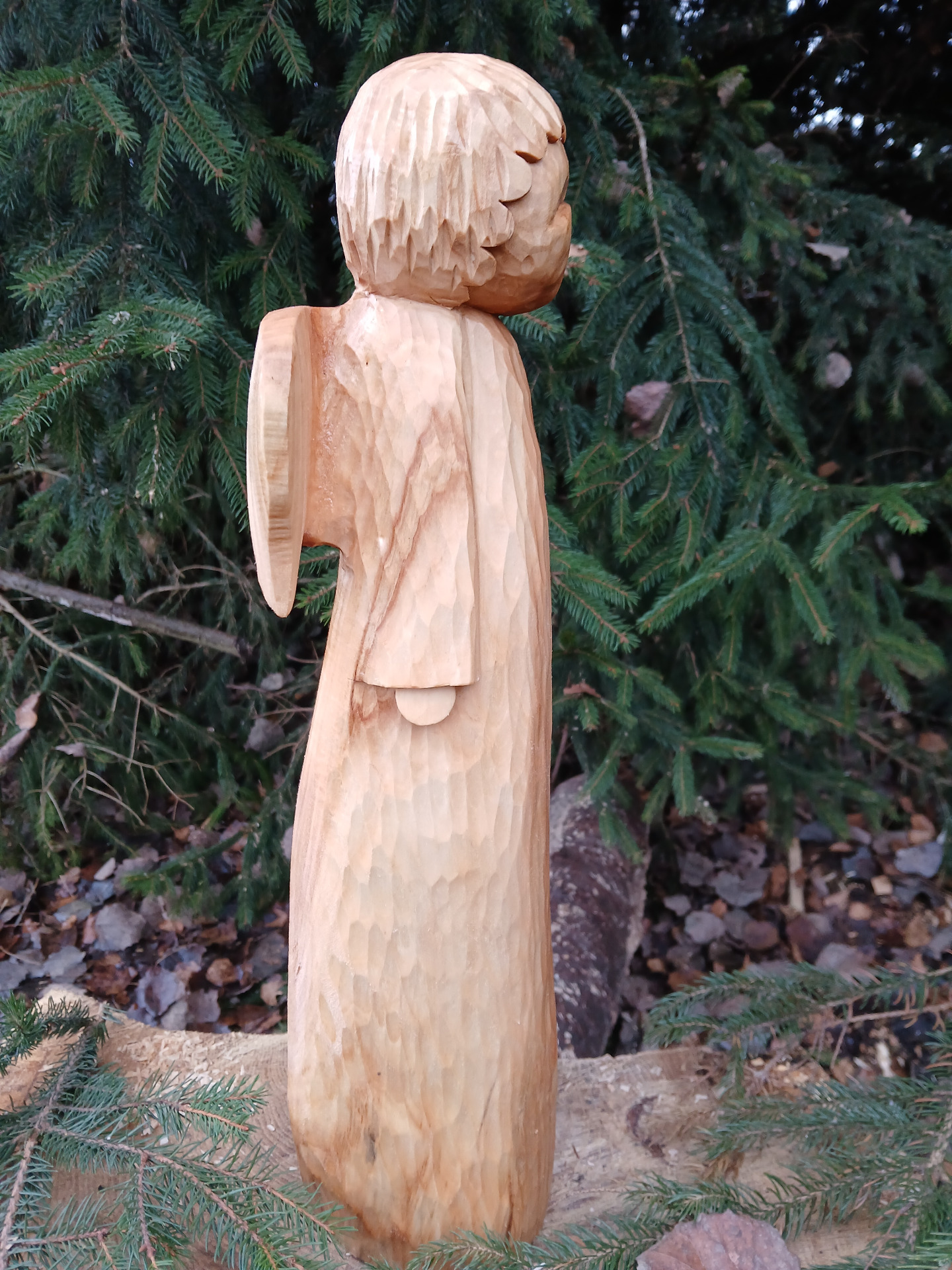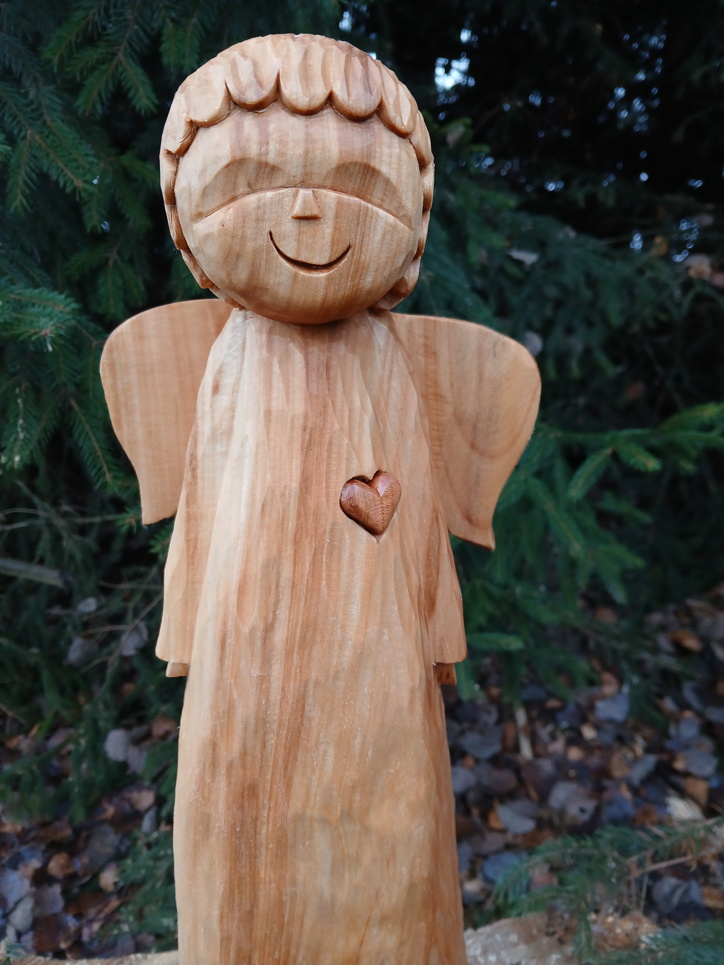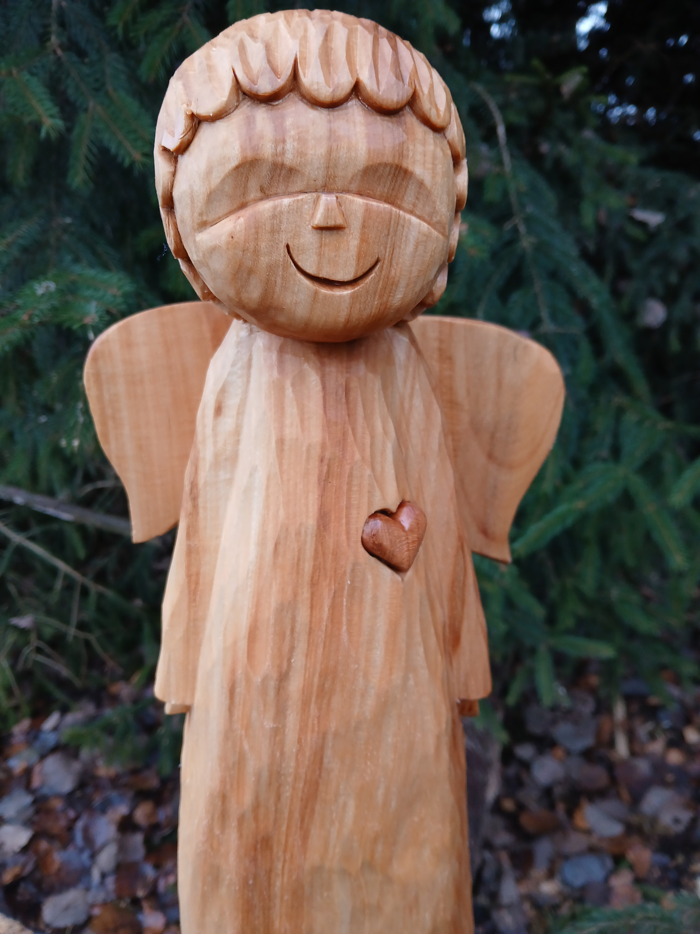 Ručně vyřezaný anděl z jednoho kusu lipového dřeva s hruškovým srdíčkem. Soška je ošetřena světlicovým olejem. Vhodná do interieru. Anděl je symbolem ochrany.