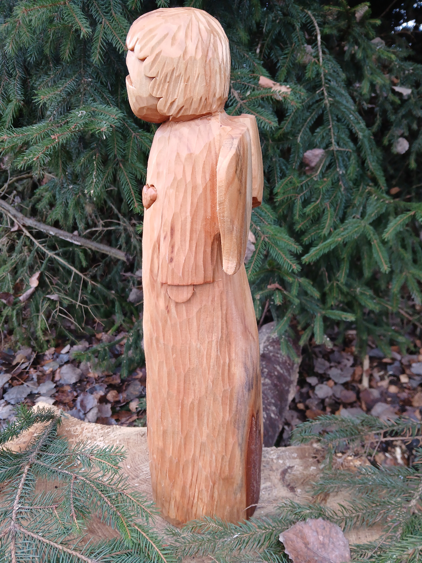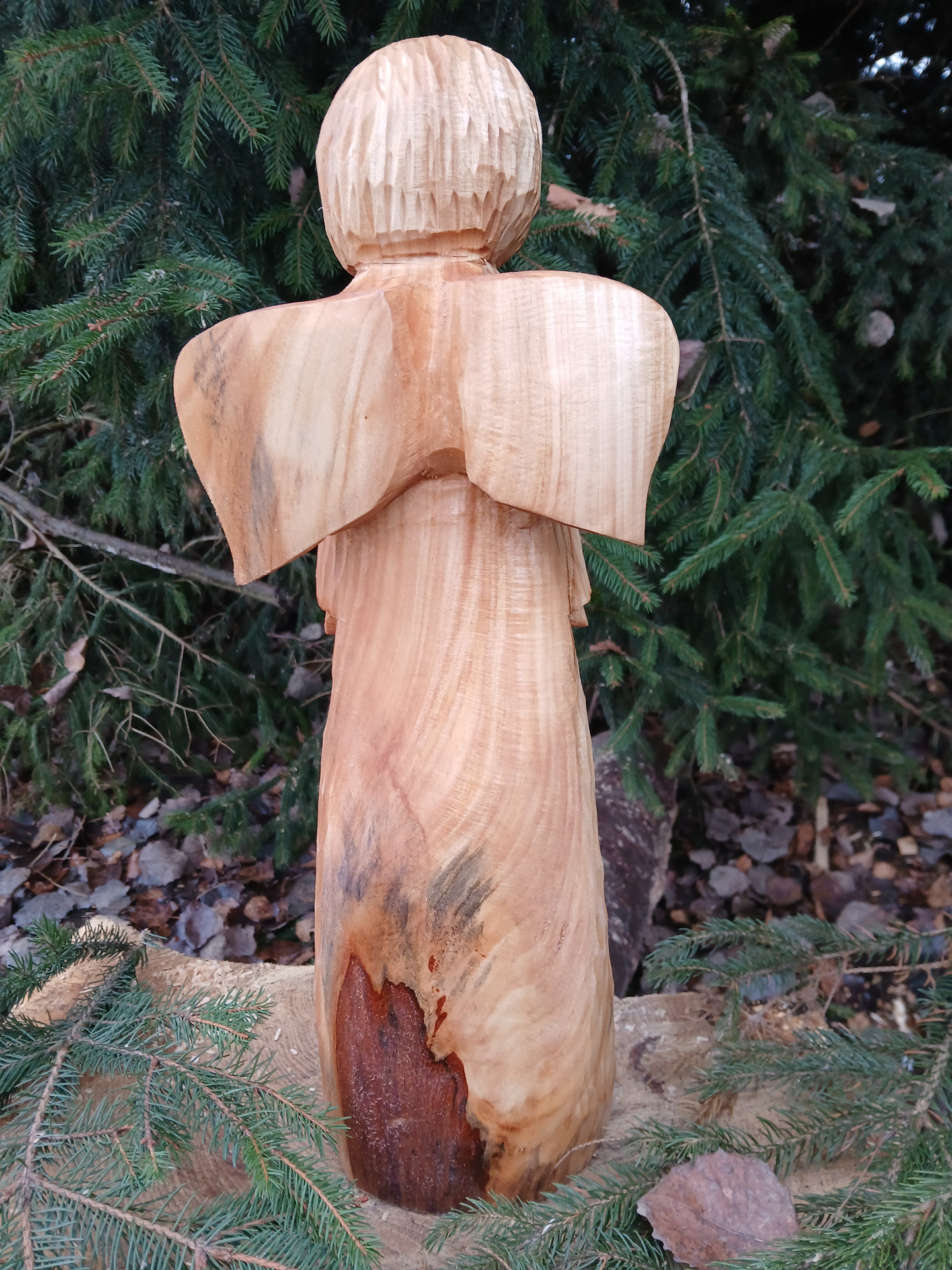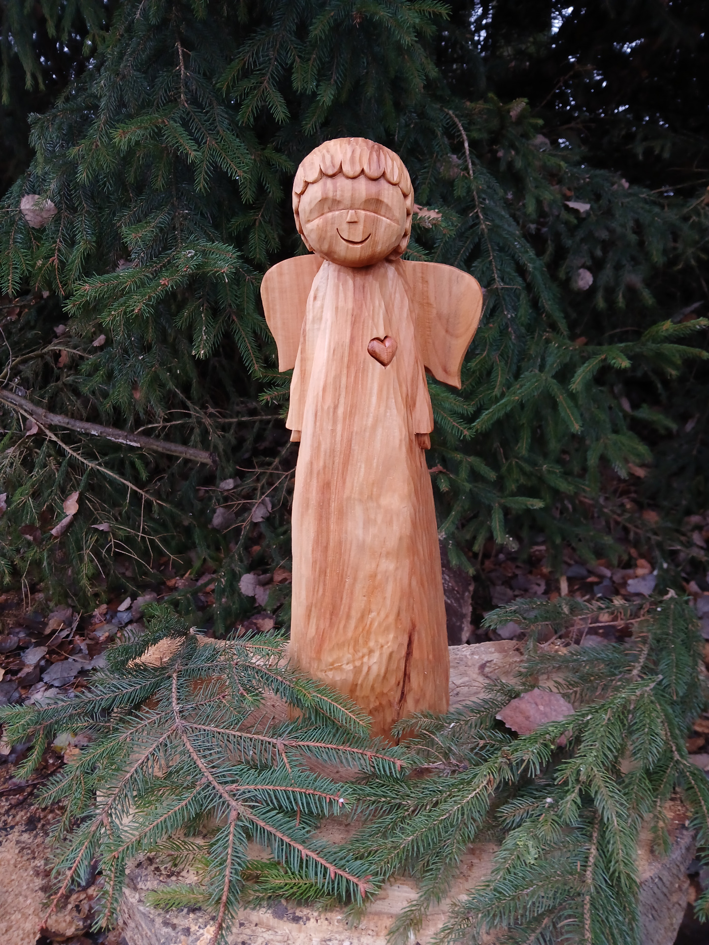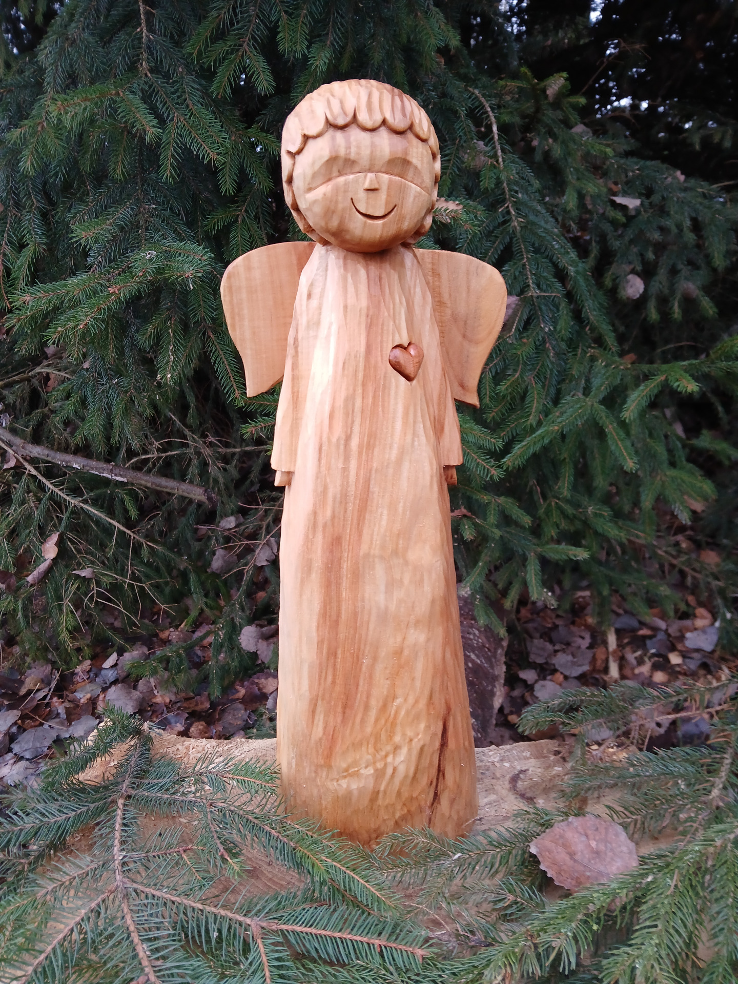 Ručně vyřezaný anděl z jednoho kusu lipového dřeva s hruškovým srdíčkem. Soška je ošetřena světlicovým olejem. Vhodná do interieru. Anděl je symbolem ochrany.