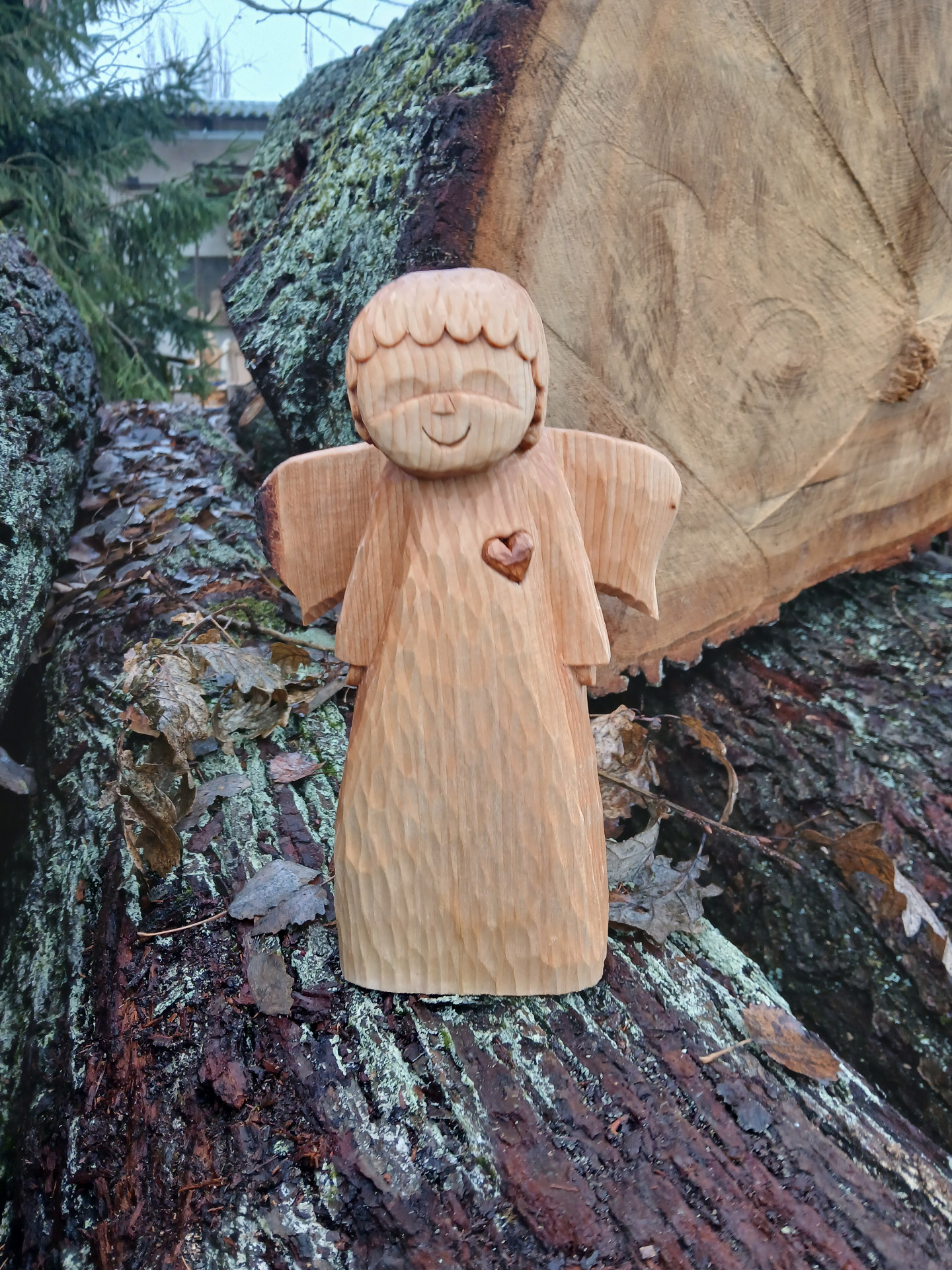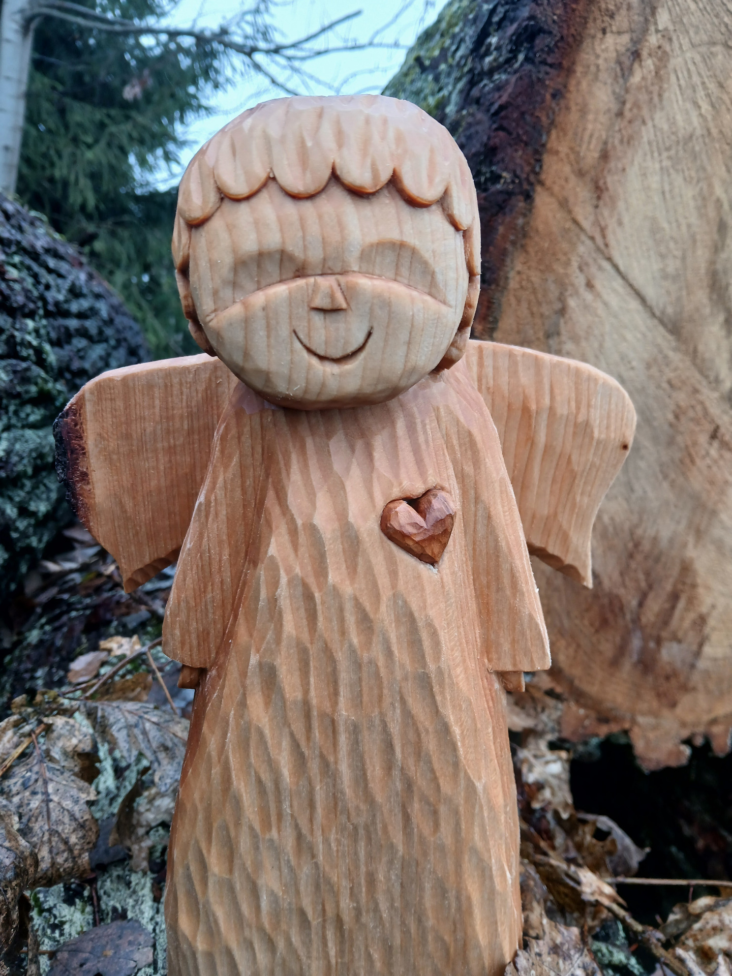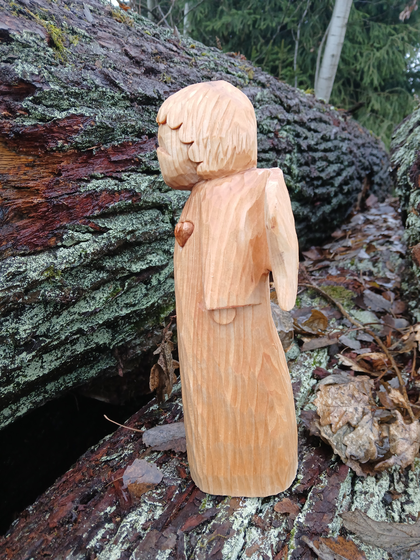 Ručně vyřezaný andílek z jednoho kusu lipového dřeva. Srdíčko z hrušně je vsazené a vlepené.