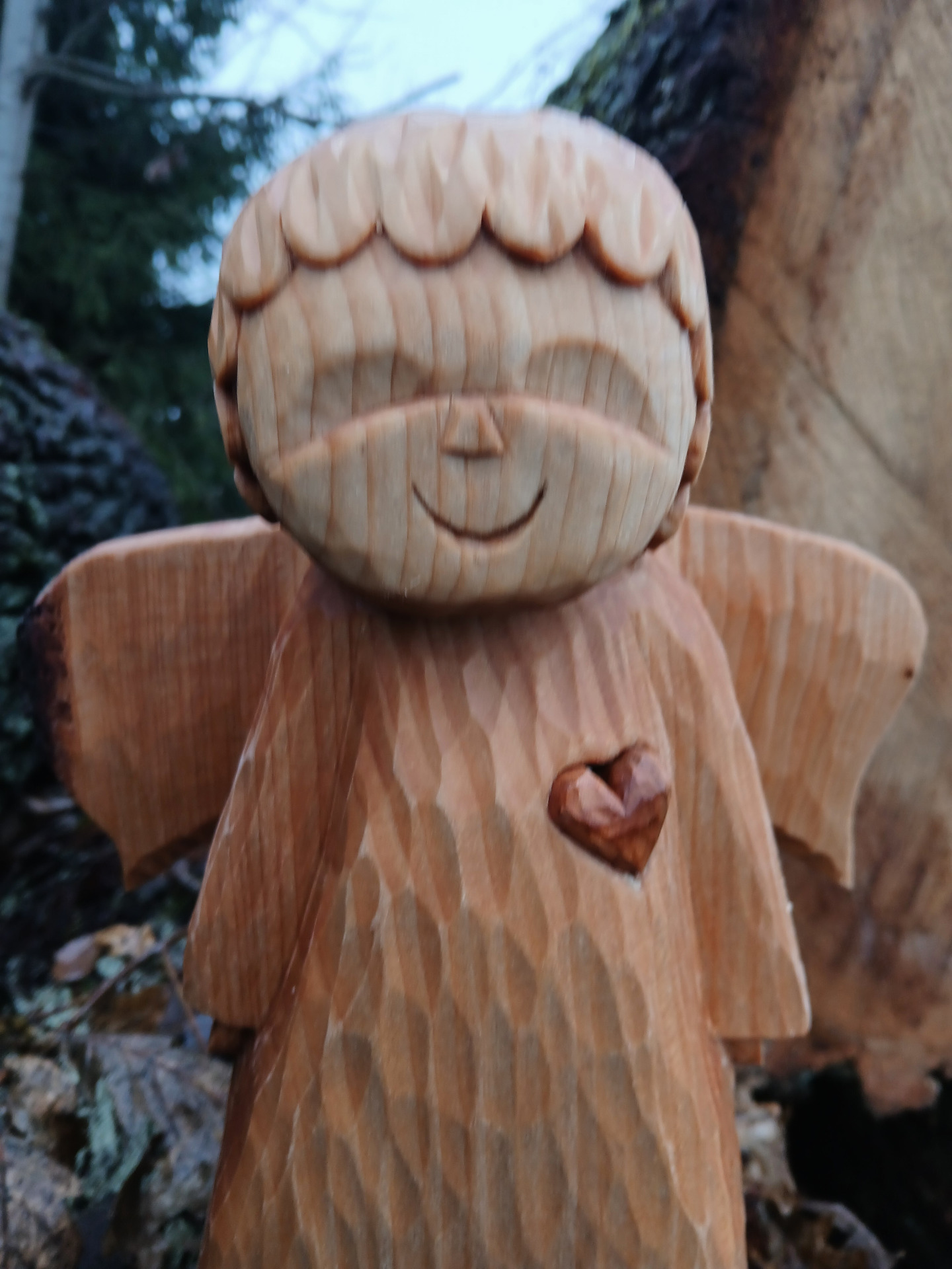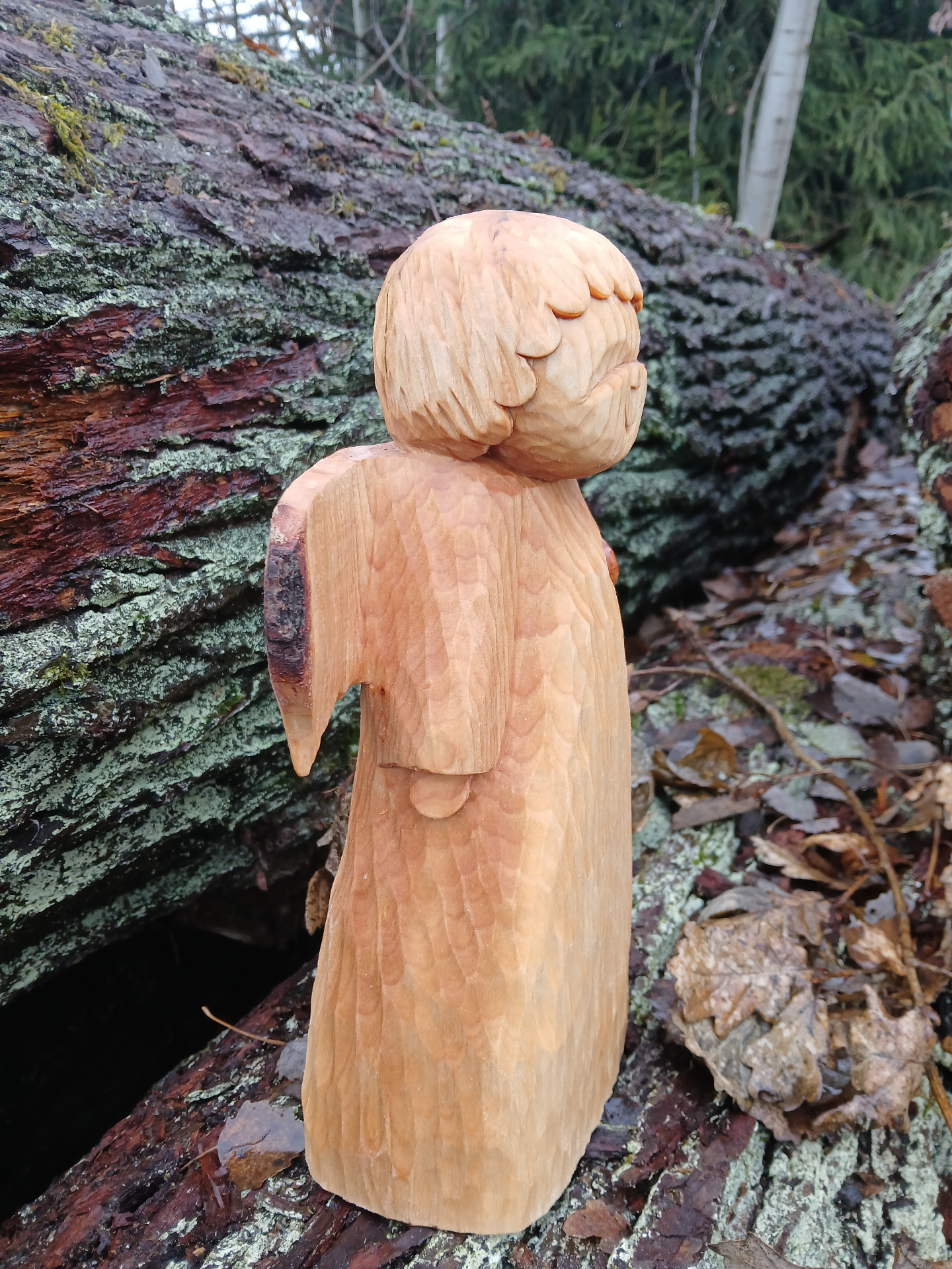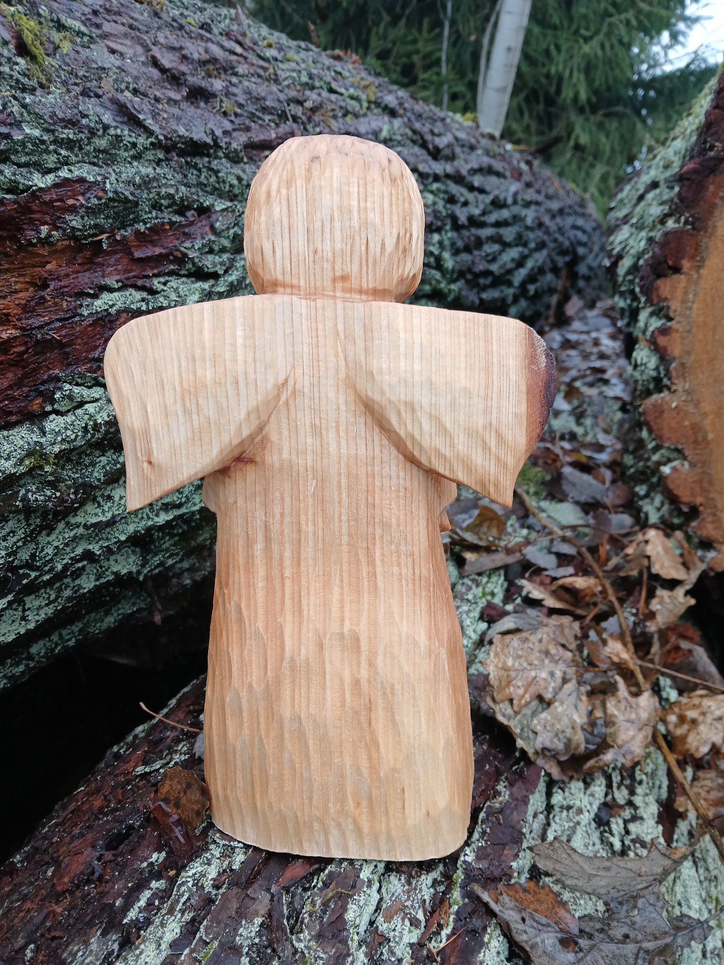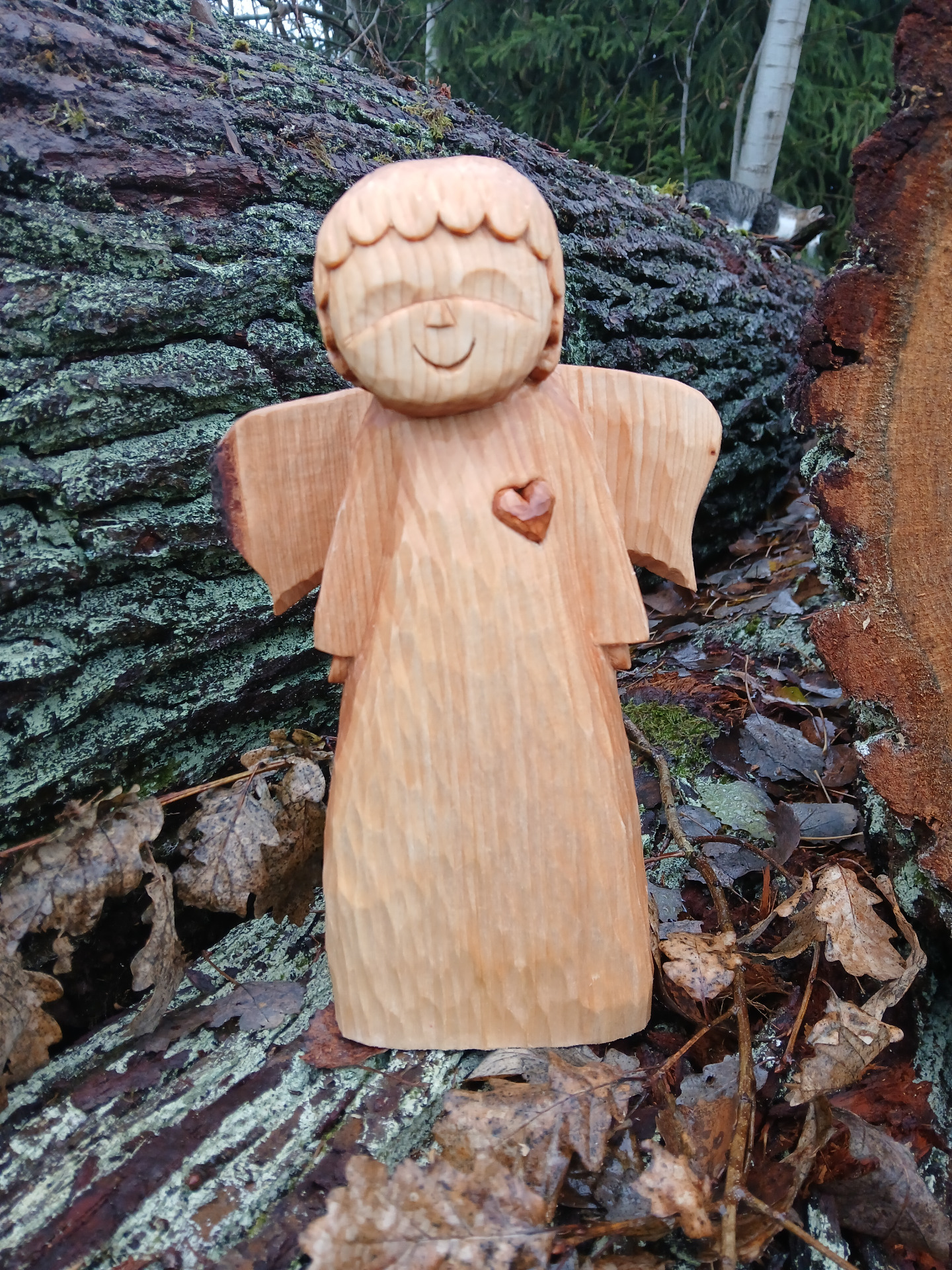Ručně vyřezaný andílek z jednoho kusu lipového dřeva. Srdíčko z hrušně je vsazené a vlepené.