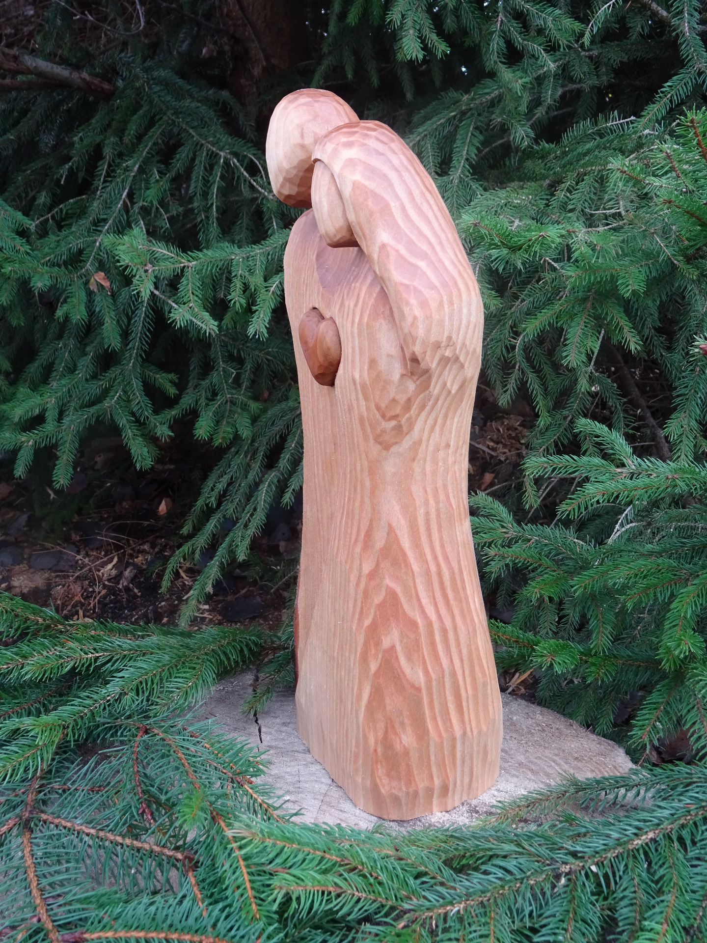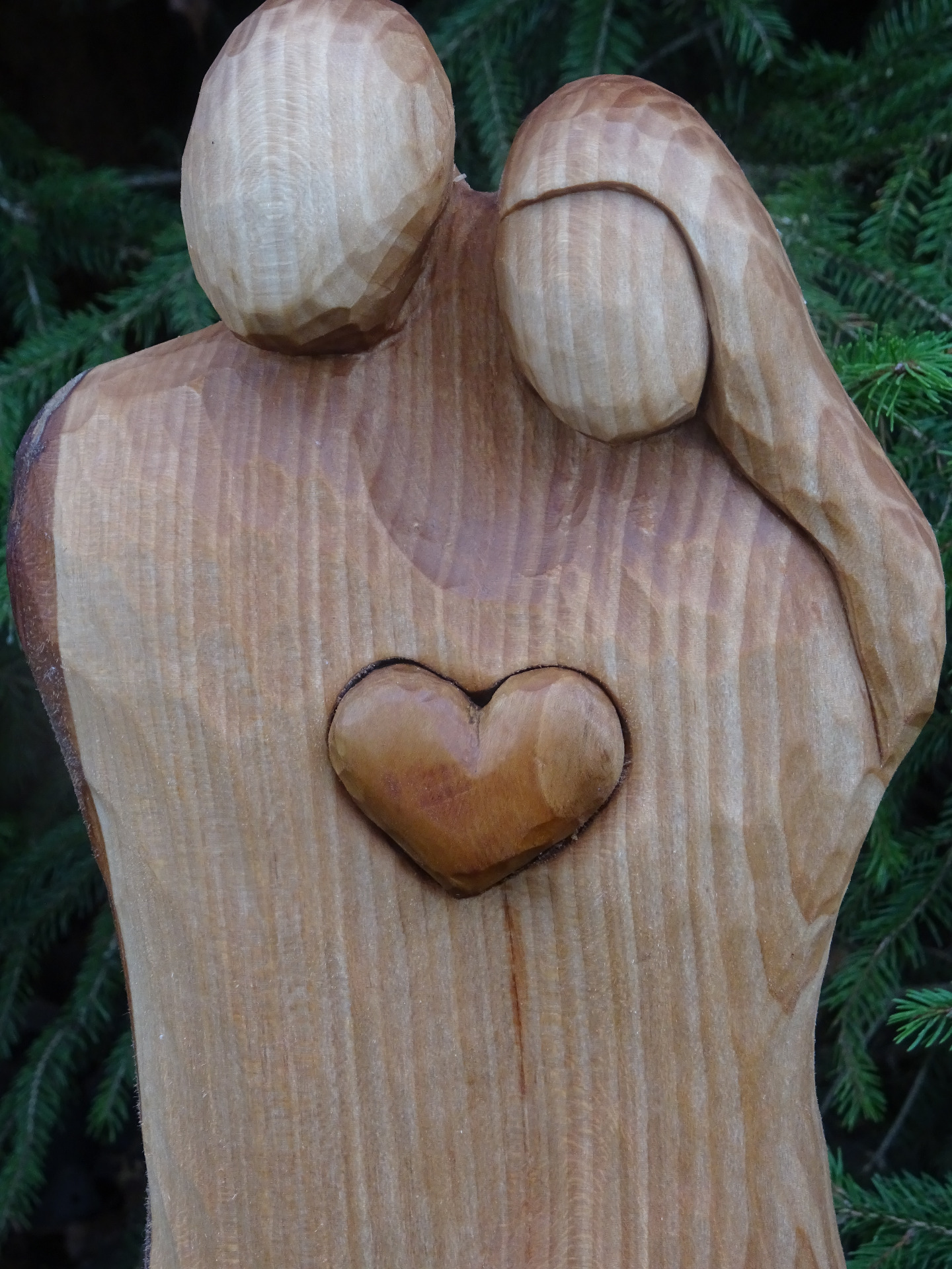 Ručně vyřezaná soška partnerství z lipového dřeva. Ošetřeno olej s voskem. Vhodné do interieru. Vsazené a vlepené srdíčko je z hrušně.