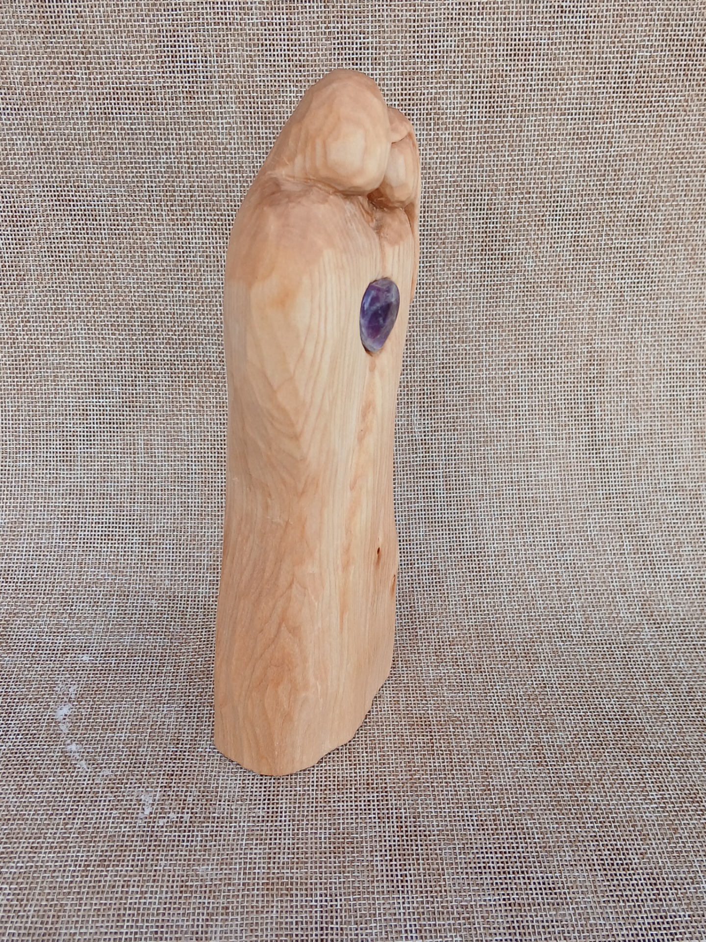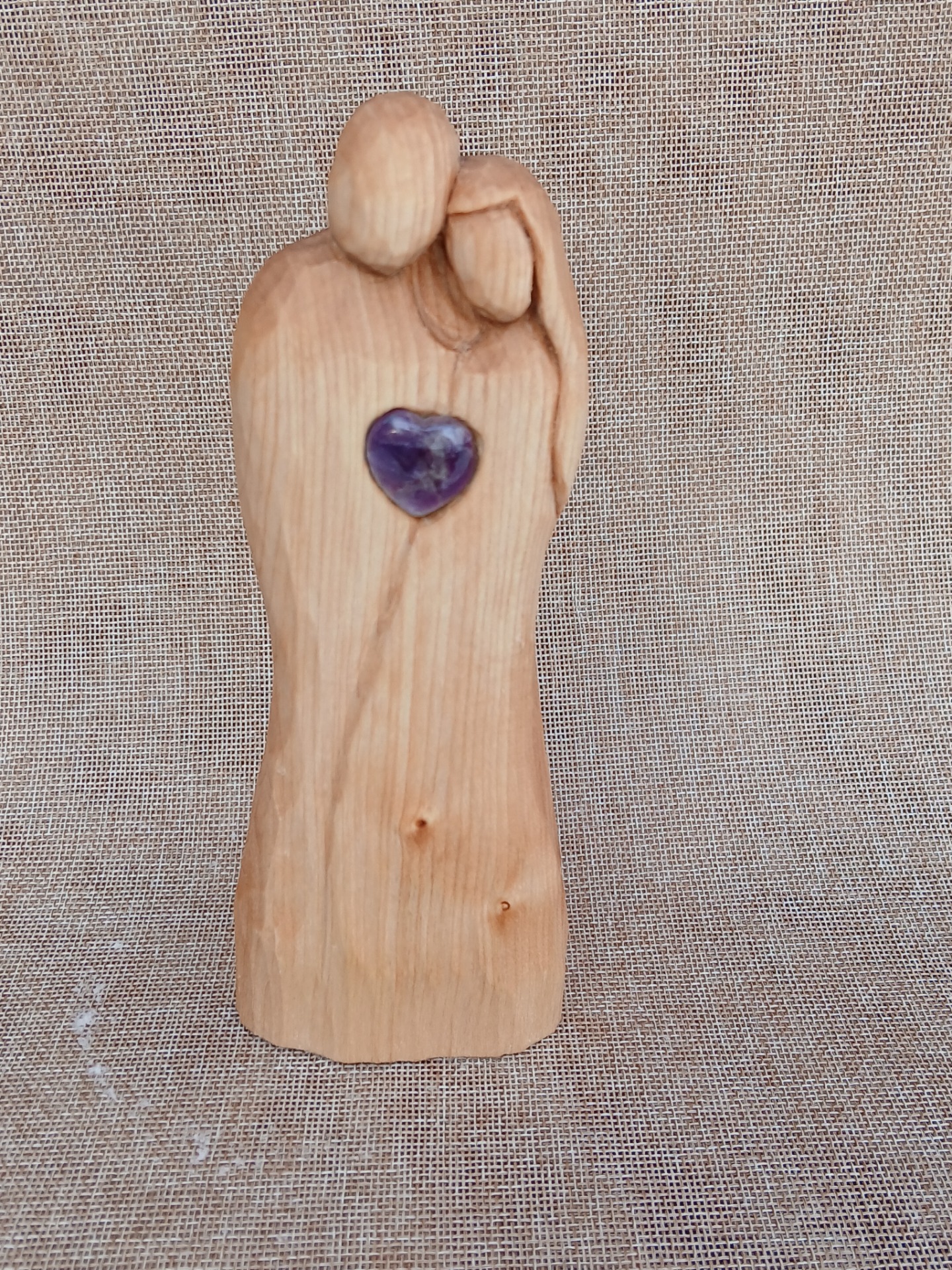 Ručně vyřezaná soška z lipového dřeva. Ošetřena světlicovým olejem. Srdíčko ametyst je vsazené a vlepené.Milý dárek ke svátku zamilovaných anebo jen tak z lásky. ❤️ 20 cm x 8cm